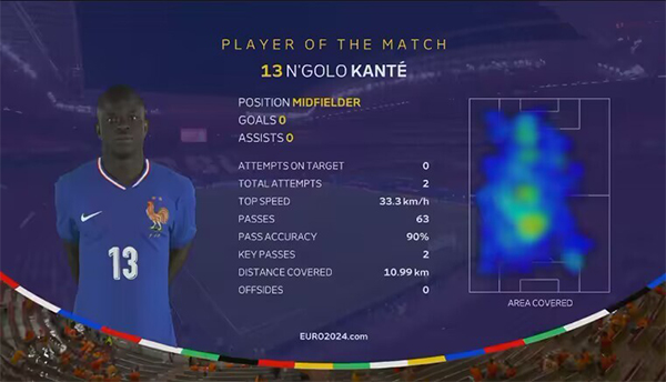 根据赛后统计,坎特此役2次射门,贡献2次抢断,3次关键传球,传球成功率90%,他的比赛热图,几乎覆盖了球场的大部分位置。而坎特也毫无悬念,再次获得欧足联评选的本场官方MVP。