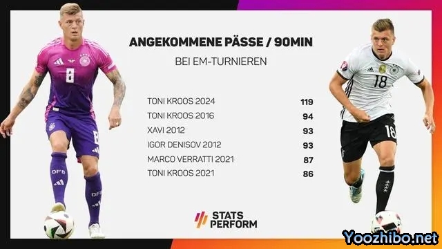 来源:JRS直播网06-25 16:08JRS直播网讯 根据统计,现年34岁的托尼-克罗斯本届欧洲杯小组赛前两轮平均每90分钟能够为队友送出119脚传球,在欧洲杯历史上所有出场至少150分钟的中场球员里,这样的数据排名第一。