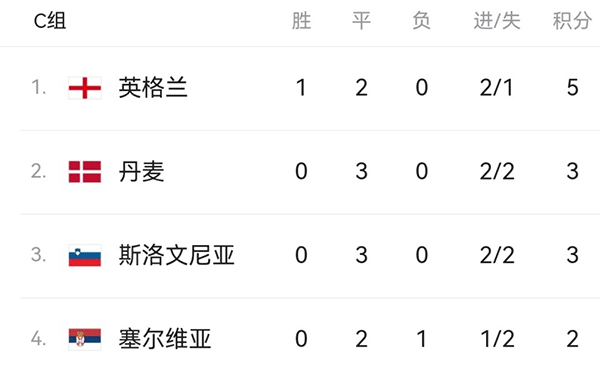 来源:JRS直播网06-26 17:15JRS直播网讯 北京时间6月26日凌晨,欧洲杯C组结束了末轮的2场较量,最终英格兰与斯洛文尼亚、丹麦与塞尔维亚的比赛,全部踢成0-0平。如此一来,本组也出现了一个奇特景象。