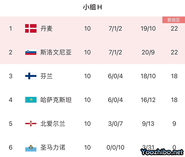按照规则,丹麦和斯洛文尼亚只能比较预选赛的排名,而这两支球队刚好在预选赛中同分在H组,甚至积分都是22分。如此多的数据相同,斯洛文尼亚和丹麦堪称是结下了不解之缘。