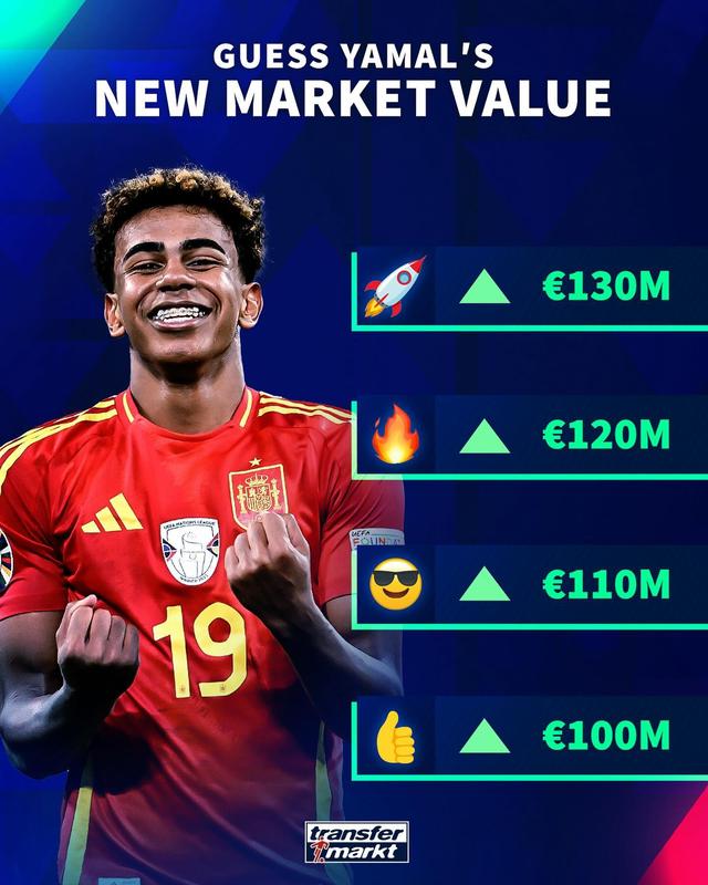 JRS直播网讯 德转将在周四更新球员身价,他们预热了欧洲杯表现出色的亚马尔身价。