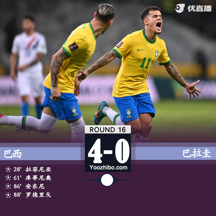 JRS直播网2月2日讯 北京时间2月2日8:30,卡塔尔世界杯南美预选赛第16轮巴西主场迎战巴拉圭的比赛。上半场拉菲尼亚闪击被吹后低射破门,半场战罢,巴西1-0巴拉圭。下半场拉菲尼亚中柱,库蒂尼奥远射世界波破门,安东尼、罗德里戈替补再进两球,最终巴西4-0大胜巴拉圭保持不败。