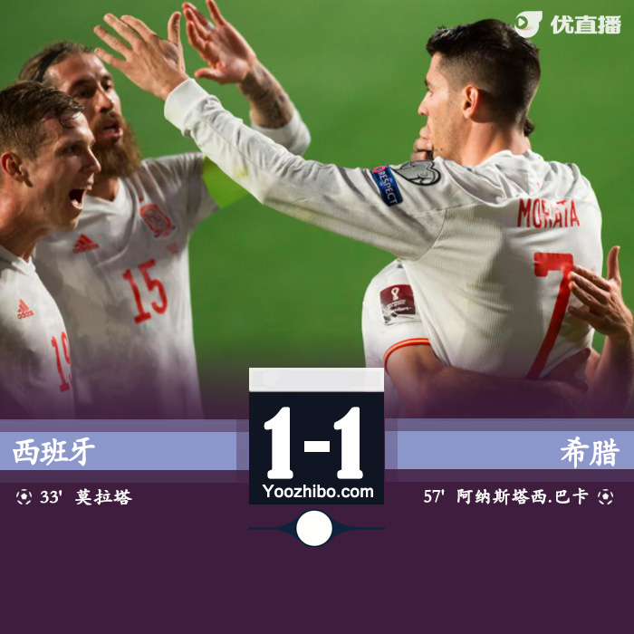 JRS直播网3月26日讯 北京时间03月26日星期五03:45,世预赛欧洲区B组西班牙对阵希腊世界杯预选赛打响。上半场,科克助攻莫拉塔首开记录,半场西班牙1-0领先希腊。下半场,马丁内斯替补登场被判罚黄点套餐,巴卡斯塔斯点射扳平。最终,西班牙1-1战平希腊,双方各取1分。