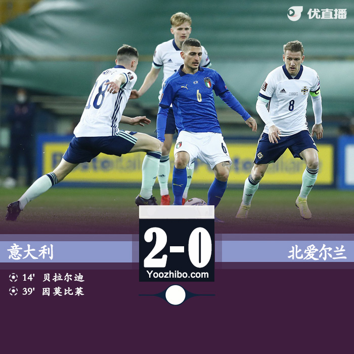 JRS直播网3月26日讯 北京时间3月26日3点45分,世预赛欧洲区C组意大利主场迎战北爱尔兰。上半场贝拉尔迪和因莫比莱各入一球,下半场两队再无建树,最终意大利主场2-0击败对手。