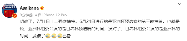 JRS直播网讯朱艺在微博上写道:“明确了,7月1日十二强赛抽签。6月24日进行的是亚洲杯预选赛的第三轮抽签。也就是说,亚洲杯组委会发的是世界杯预选赛的时间,发对了,世界杯组委会发的是亚洲杯的时间,发错了,已昏。 ”