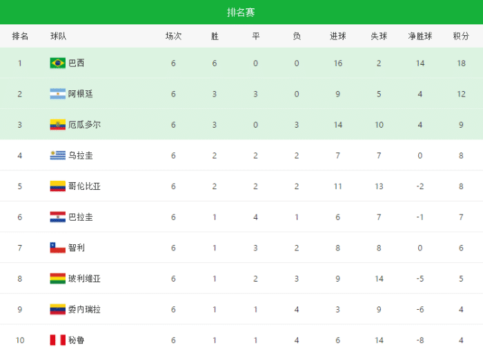世预赛南美区积分榜!巴西队全胜,阿根廷遭绝平,乌拉圭重返前四