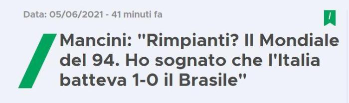 来源:JRS直播网06-06 14:52JRS直播网讯近日,意大利主帅曼奇尼在接受《体育周刊》采访时表示,他最后悔的一件事就是拒绝参加1994年世界杯。