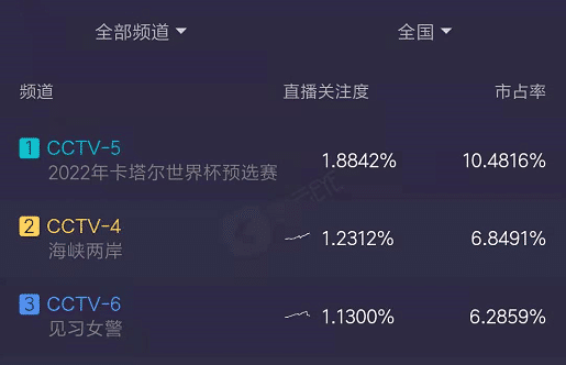 而比赛实时期间,国足的收视率一度高达1.88%,市场占比超过10%;同时间段第一名,比很多新闻节目和电视剧高出很多,从这点就可以看出国足的影响力。