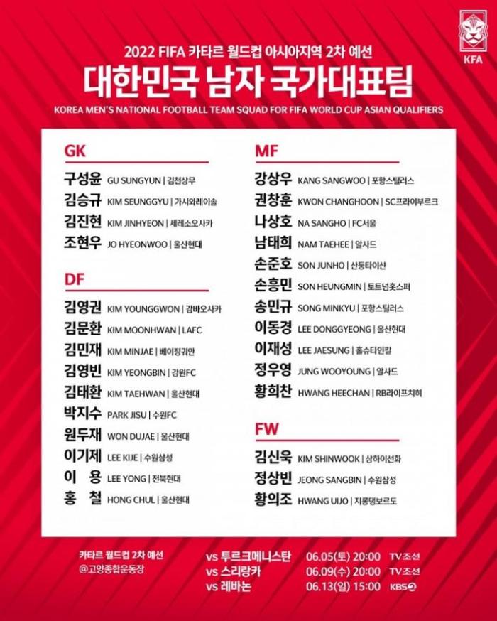 韩国最新大名单: 孙兴慜领衔, 中超3人入选