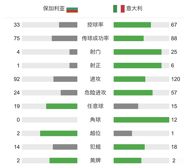 全场比赛结束,保加利亚0:2意大利,意大利全取三分。