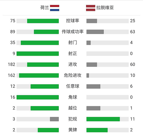 全场比赛结束,荷兰2-0击败拉脱维亚。