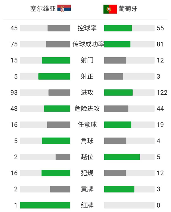 全场比赛结束,葡萄牙客场2-2战平塞尔维亚。