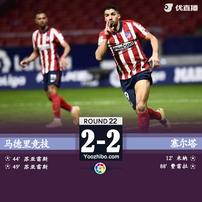 JRS直播网2月9日讯 北京时间2月9日04:00,西甲第22轮继续进行,马德里竞技主场迎战塞尔塔。上半场,米纳冲顶帮塞尔塔取得领先,M-略伦特助攻苏亚雷斯铲射扳平比分。下半场,洛迪助攻苏亚雷斯再入一球反超比分,法昆多-费雷拉打入绝平进球。最终,马德里竞技2-2战平塞尔塔,八连胜遭终结,8分优势继续领跑积分榜。