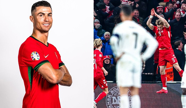 在首回合丹麦主场1-0击败葡萄牙的比赛中,曼联射手霍伊伦打进制胜进球,进球后,霍伊伦在曼联前辈C罗面前做出了其标志性的“SIU”的庆祝动作。