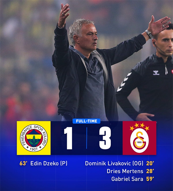 最终,费内巴切1-3在主场失利。穆里尼奥执教生涯的首场土耳其国家德比,也以失利告终。