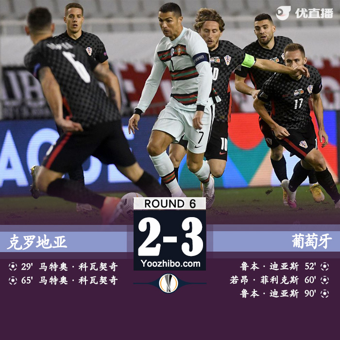 JRS直播网讯:北京时间11月18日03:45(克罗地亚当地时间17日20:45),2020/21赛季欧国联A组第3小组第6轮一场焦点战在波伦德球场展开争夺,葡萄牙客场3比2险胜克罗地亚,科瓦契奇梅开二度,曼城铁闸迪亚斯打入2球,菲利克斯进球。罗格对C罗犯规被罚下。