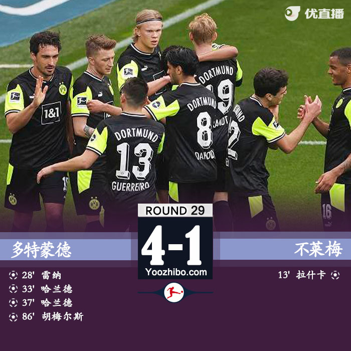 JRS直播网4月18日讯 北京时间4月18日晚上21:30,2020-21赛季德甲第29轮,多特蒙德坐镇主场迎战不莱梅。上半场,拉希察单刀破门,雷纳爆射扳平比分,罗伊斯造点哈兰德主罚命中,哈兰德推空门得手。半场战罢,多特蒙德暂3-1不莱梅。下半场,罗伊斯屡造险,埃格斯泰因中柱,哈兰德头球破门越位,塞拉西乌龙。全场比赛结束,多特蒙德4-1不莱梅,本赛季双杀对手的同时,距欧冠区4分。