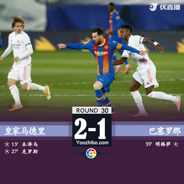 JRS直播网4月11日讯 北京时间4月11日凌晨3点整,2020-21赛季西甲第30轮国家德比在迪斯蒂法诺球场展开角逐,皇家马德里坐镇主场迎战巴塞罗那。上半场本泽马脚后跟破门,克罗斯任意球扩大比分,巴斯克斯伤退,梅西角球中柱。下半场明格萨扳回一城,卡塞米罗染红,莫里巴终场前中框。最终皇家马德里主场2-1战胜巴塞罗那,皇马本赛季双杀巴萨,巴萨19轮不败遭终结。积分榜方面,皇马积66分暂时升至榜首,巴萨积65分下滑至第3名。