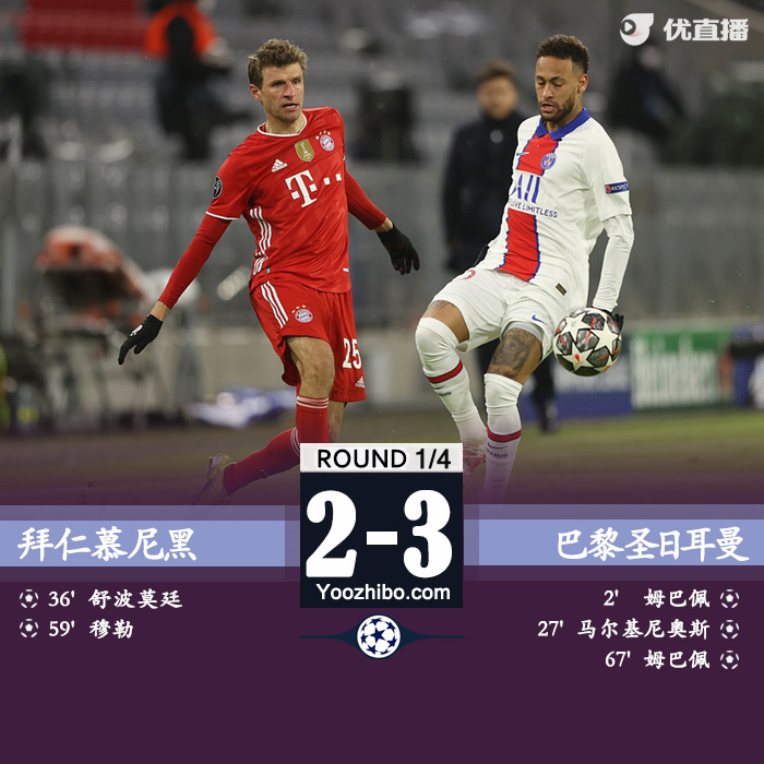 JRS直播网4月8日讯 北京时间4月8日3:00,欧冠八强战首回合一场焦点战在拜仁和巴黎之间进行。上半场舒波莫廷头球中框,姆巴佩破门,马尔基尼奥斯破门后伤退,舒波莫廷扳回一球。下半场穆勒扳平比分,姆巴佩再入一球。最终拜仁主场2-3不敌巴黎,双方次回合将在4月14日凌晨进行。