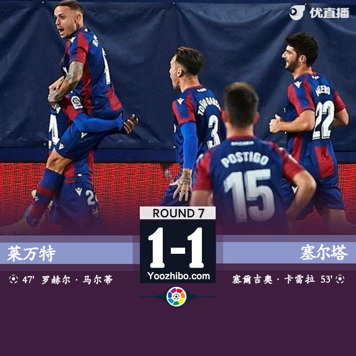 JRS直播网讯:北京时间10月27日凌晨,2020-2021赛季欧洲五大联赛结束最新一轮比赛争夺。其中,莱万特主场迎战塞尔塔,马尔蒂破门卡雷拉处子球,莱万特1-1塞尔塔。