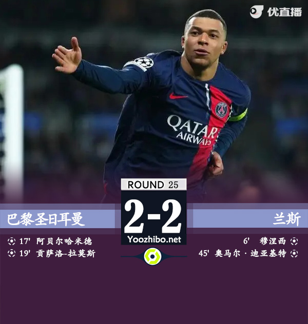 JRS直播网讯 3月10日北京时间20:00,法甲第25轮,巴黎主场迎战兰斯。本场比赛姆巴佩近5轮第3次替补。上半场,阿什拉夫送大礼,穆涅西轻松破门。贡萨洛-拉莫斯2分钟之内造乌龙+破门,迪亚基特半场尾声单刀扳平比分;下半场,姆巴佩第73分钟替补登场。最终,巴黎2-2战平兰斯,联赛遭遇三连平!积分榜仍10分领跑。