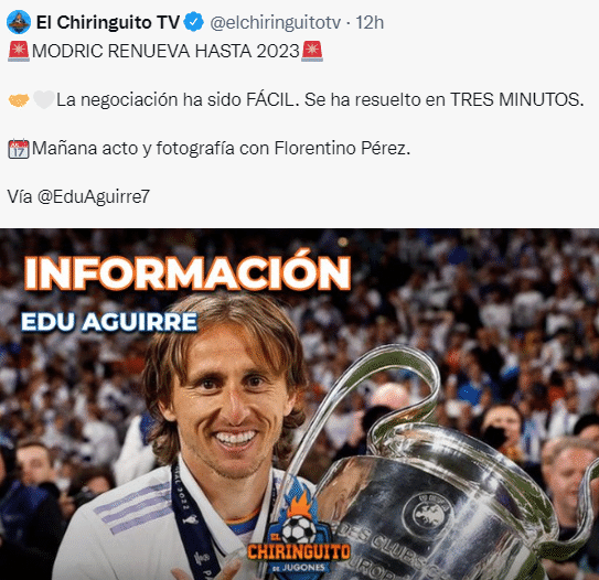 JRS直播网06月08日讯 据西班牙六台报道,皇马与莫德里奇仅谈判了3分钟,就达成了续约协议。