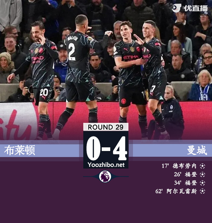 JRS直播网讯:北京时间4月26日,英超第29轮补赛,曼城客战布莱顿。上半场,德布劳内鱼跃头球破门,福登任意球直接破门后笑纳对方大礼推射破门完成双响。易边再战,阿尔瓦雷斯再下一城。最终曼城4-0布莱顿。积分榜方面,曼城少赛一场继76分落后榜首阿森纳1分,布莱顿44分第11。