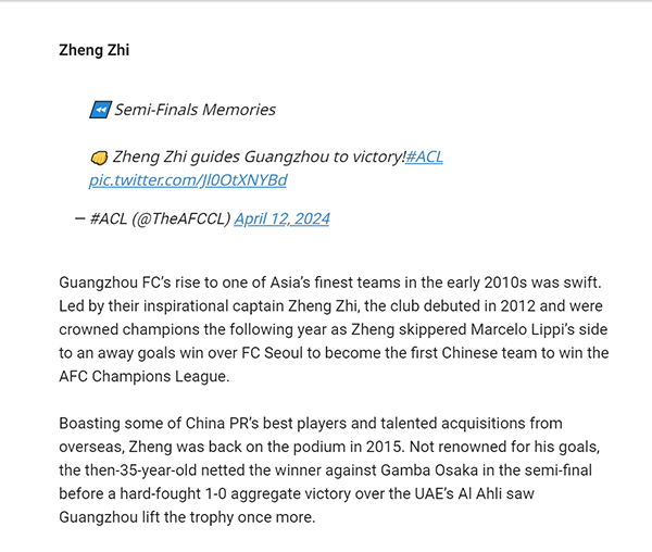 郑智也入选亚冠历史十大传奇,亚足联认为他是广州队的传奇队长,进球不是特长但是能够带领球队两次夺取亚冠冠军。值得一提的就是,亚足联也认证了广州队的荣誉。亚足联表示,广州足球俱乐部在2010年代初迅速崛起为亚洲最优秀的球队之一。该俱乐部于2012年首次亮相亚冠,并在次年加冕冠军。当时,里皮率领广州队在客场战胜首尔FC,成为首支赢得亚冠联赛的中国球队。2015赛季,广州队在斯科拉里的带领之下,决赛两回合以1-0的总比分艰难战胜阿联酋的阿赫利队,再次捧起冠军奖杯。