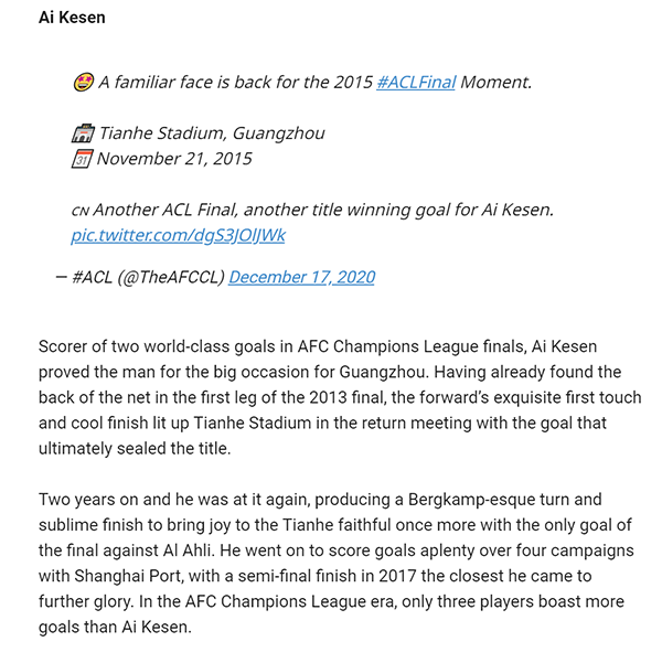 亚足联在官方网站发布了篇文章,评选亚冠历史10大传奇球员。其中包括:权纯泰、奥马尔、萨勒姆、李东国、穆罕默德、阿部勇树等球员。其中,当年在两届亚冠决赛进球的外援,现中国男足前锋艾克森同样入选,并且被夸赞比肩阿森纳名宿博格坎普。亚足联评价艾克森两个世界波在亚冠决赛展现,是广州队的风云人物,而他的两个进球也为广州队夺得了两个冠军。