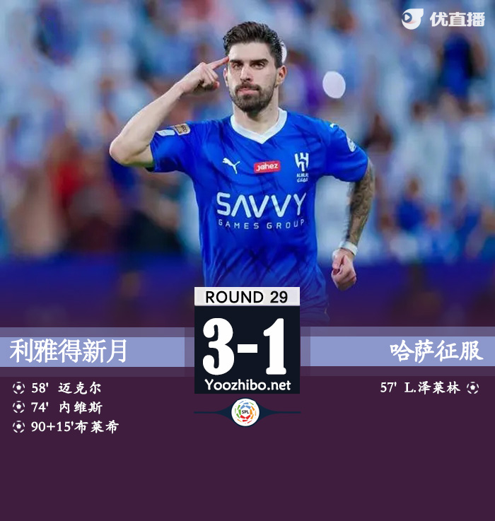 JRS直播网讯:北京时间4月26日晚23时整,2023-24赛季沙特联第29轮展开角逐,利雅得新月坐镇主场迎战哈萨征服,上半场新月仅1脚射正,下半场泽拉拉扬打破僵局,迈克尔闪电扳平,内维斯点射反超,布莱希补时第15分钟破门。最终利雅得新月主场3-1逆转哈萨征服,积分榜方面,新月联赛28轮保持不败,联赛剩6轮以12分优势领跑。