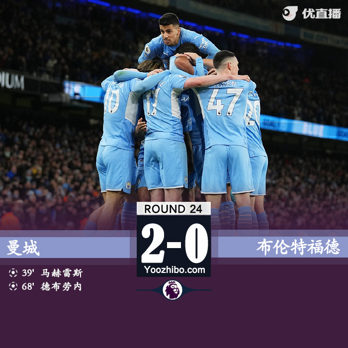 JRS直播网2月10日讯 北京时间2月10日03:45,英超第24轮继续进行,曼城主场迎战布伦特福德。上半场,斯特林制造点球,马赫雷斯主罚命中。下半场,德布劳内利用大卫-拉亚的失误再入一球。最终,曼城2-0战胜布伦特福德14轮不败,12分优势继续领跑积分榜。