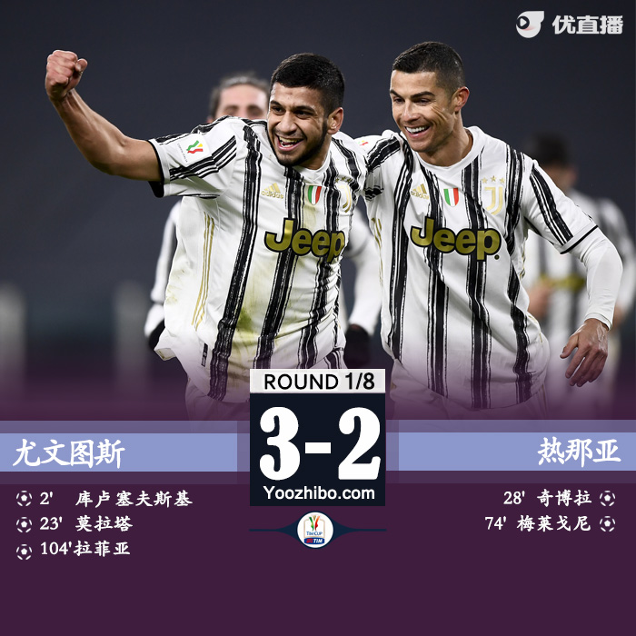JRS直播网1月14日讯 北京时间1月14日4:15,意大利杯1/8决赛,尤文迎战热那亚。上半时库卢塞夫斯基斩传射,莫拉塔破门,茨博拉扳回1球,尤文两粒进球越位在先无效。下半时皮亚察中框,梅莱格尼扳平比分。90分钟战罢2-2双方进加时,加时上半时莫拉塔达成传射助拉菲亚破门,加时下半时阿图尔门线救主。最终,尤文3-2热那亚晋级,尤文1/4决赛将对阵萨索洛与斯帕尔之间的胜者。
