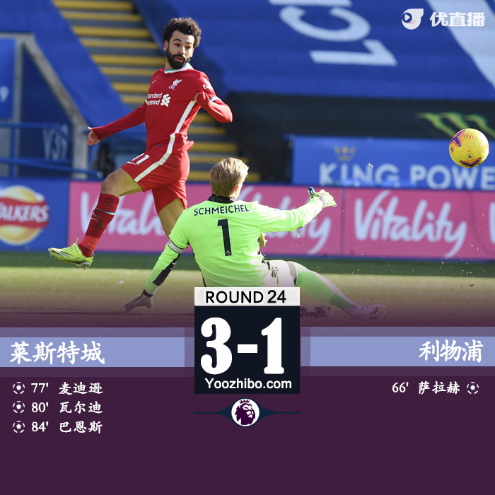 JRS直播网2月13日讯北京时间2月13日20点30分,英超第24轮莱斯特城主场迎来强敌利物浦。上半场,米尔纳伤退,利物浦呈现围攻之势但未能破门,小舒梅切尔多次做出成功扑救,瓦尔迪反击射中横梁。下半场,阿诺德任意球攻门击中横梁,萨拉赫兜射破门,麦迪逊任意球扳平比分,利物浦后防失误送礼,瓦尔迪打进反超球,巴恩斯锁定胜局,全场比赛结束,莱斯特城3-1利物浦。本场比赛过后,莱斯特城在多赛2场的情况下拿到46分升到积分榜第二,落后榜首的曼城4分。利物浦遭遇三连败后则是以40分继续排在第四,在先赛一场的情况下仅领先身后的切尔西和西汉姆1分。