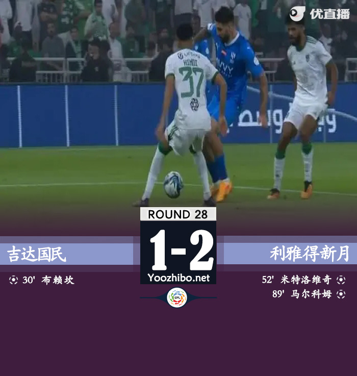 JRS直播网讯:北京时间5月7日凌晨2时整,2023-24赛季沙特联第28轮补赛展开角逐,吉达国民坐镇主场迎战利雅得新月,上半场马赫雷斯中柱,布赖坎打破僵局,下半场米特洛维奇头球扳平,马尔科姆一条龙绝杀。最终利雅得新月客场2-1逆转吉达国民,新月联赛30轮不败,积分榜方面,新月领先第2名胜利12分居榜首,再拿1分即夺冠,国民积55分位列第3。
