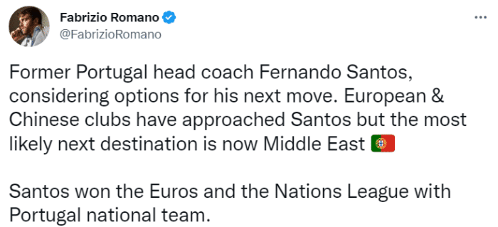 罗马诺表示,前葡萄牙主帅费尔南多-桑托斯正在考虑自己的下一站。已经有来自欧洲和中国的俱乐部接触了桑托斯,但他最有可能的下一站还是中东。