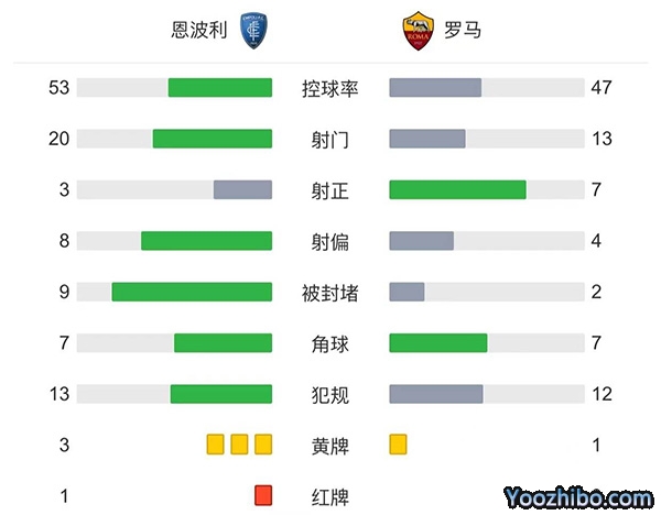 第17分钟,曼奇尼右路传中,防守球员解围不远,迪巴拉禁区弧顶得球调整一步起脚远射,球划出美妙弧线飞进球门!恩波利0-1罗马!