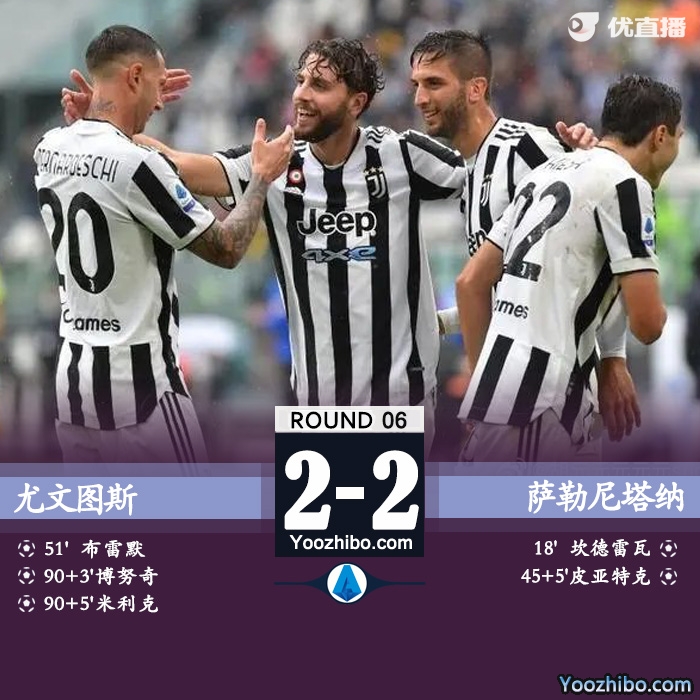全场比赛结束,尤文图斯主场2-2战平萨勒尼塔纳。