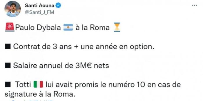 罗马诺和迪马济奥等名记确认迪巴拉即将免费加盟罗马,记者SantiAouna透露了他转会的细节。