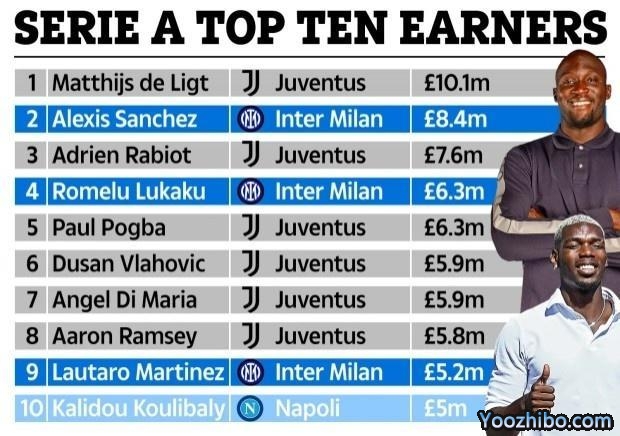 JRS直播网07月11日讯 今夏,卢卡库和博格巴重回意甲,迪马利亚也强势登陆,《太阳报》统计了新赛季意甲联赛的薪水排行榜,前十之中有六名尤文图斯球员。