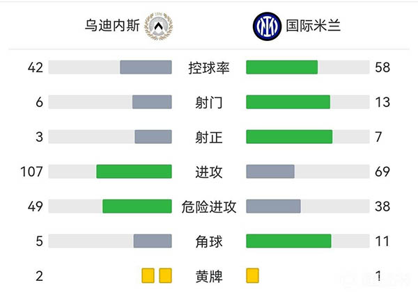 全场比赛结束,国际米兰客场2-1战胜乌迪内斯。