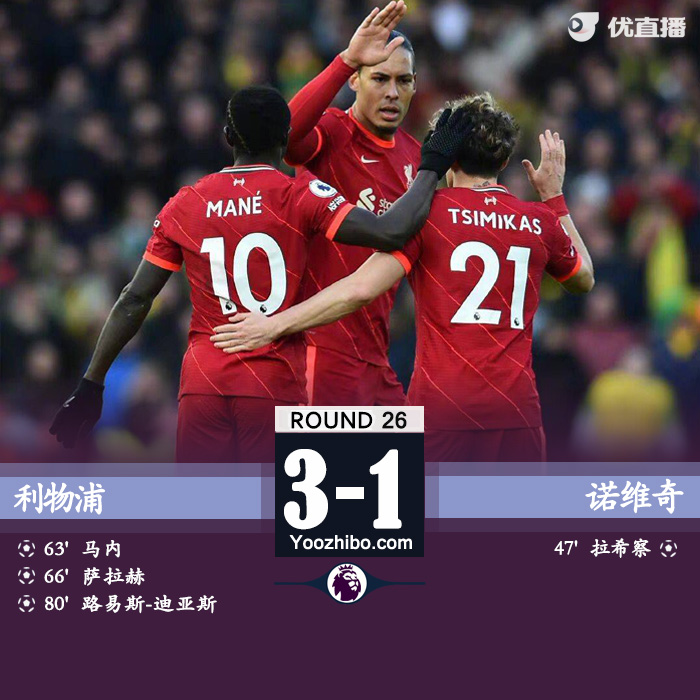 JRS直播网2月20日讯 北京时间2月19日22点,英超第26轮利物浦主场对阵诺维奇。上半场,普基错失单刀,诺曼门线救险,齐米卡斯和萨拉赫多次制造威胁但未能破门。下半场,拉希察率先破门,马内和萨拉赫3分钟内连进两球完成反超,迪亚斯打进加盟利物浦首球。全场比赛结束,利物浦3-1诺维奇。