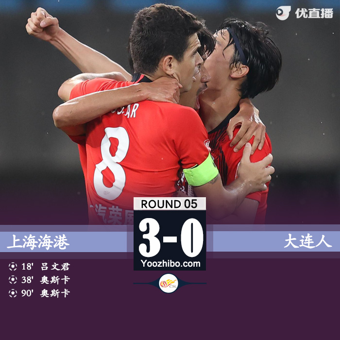 JRS直播网5月16日讯 北京时间5月16日18:00,中超联赛第5轮,上海海港对阵大连人。上半场比赛,李申圆边路传中助攻吕文君破门,奥斯卡中超百场里程碑兜射死角扩大比分。下半场比赛,奥斯卡点球破门完成梅开二度。全场比赛结束,海港3-0战胜大连人。