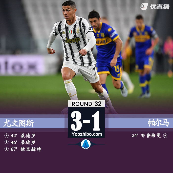 JRS直播网4月22日讯 北京时间04月22日星期四02:45,意甲第32轮尤文图斯主场迎战帕尔马。上半场,布鲁曼任意球直接破门,桑德罗凌空斩扳平,尤文半场1-1帕尔马。下半场,桑德罗完成双响,德里赫特破门,夸德拉多本场两送助攻。最终,尤文3-1逆转战胜帕尔马。斑马军团先赛一场升至意甲第三!