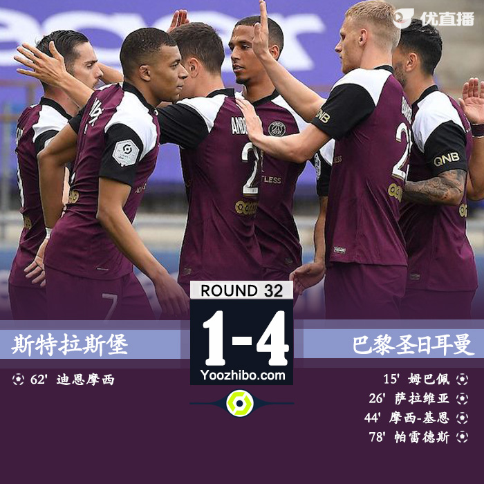 JRS直播网4月11日讯 北京时间4月10日23:00,2020/21赛季法甲联赛第32轮,斯特拉斯堡对阵巴黎圣日耳曼的比赛继续进行。上半场姆巴佩低射破僵,萨拉维亚再下一城,半场前小基恩再入一球。下半场萨希替补登场扳回一球,帕雷德斯世界波锁定胜局。全场比赛结束,最终巴黎4-1战胜斯特拉斯堡,仍落后榜首3分。