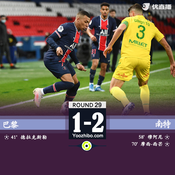 JRS直播网3月15日讯 北京时间03月15日星期一04:00,法甲第29轮巴黎圣日耳曼主场迎战南特。上半场,德拉克斯勒破门,巴黎半场1-0领先南特。下半场,姆巴佩回传失误送礼,穆阿尼传射,西芒反超比分。最终,巴黎主场爆冷1-2遭南特逆转。
