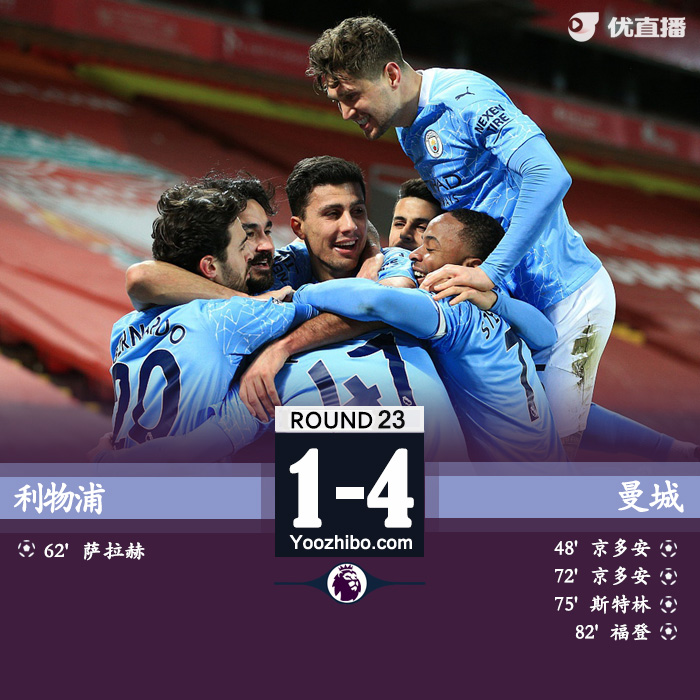 JRS直播网2月8日讯 北京时间2月8日凌晨0点30分,2020-21赛季英超第23轮焦点战在安菲尔德球场展开角逐,利物浦坐镇主场迎战曼城。上半场京多安失点,下半场京多安打破僵局,萨拉赫点射扳平,阿利森两次失误送礼,京多安、斯特林和福登扩大比分。最终曼城客场4-1战胜利物浦,蓝月亮豪取各项赛事14连胜,红军主场遭遇三连败。积分榜方面,曼城积50分继续领跑,利物浦积40分仍居第4名。