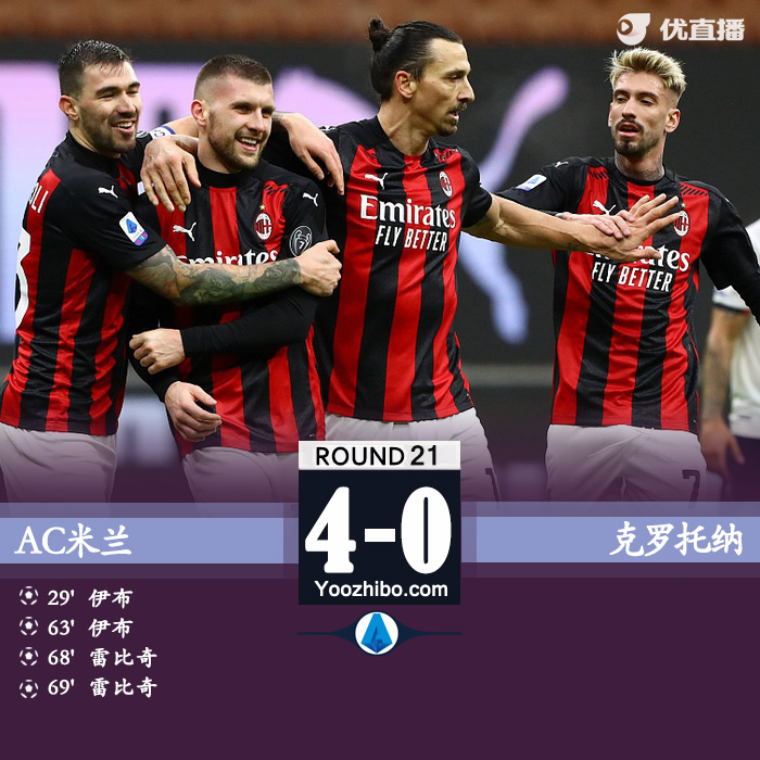 JRS直播网2月7日讯 北京时间2月7日22:00,意甲联赛第21轮一场比赛在AC米兰和克罗托内之间进行。上半场卡拉布里亚破门但因伊布越位在先进球无效,伊布推射打入个人俱乐部生涯500球。下半场特奥助攻伊布梅开二度,恰尔汗奥卢复出贡献两粒助攻,雷比奇一分钟双响。最终米兰4-0大胜克罗托内,在积分榜反超国米2分重回榜首。
