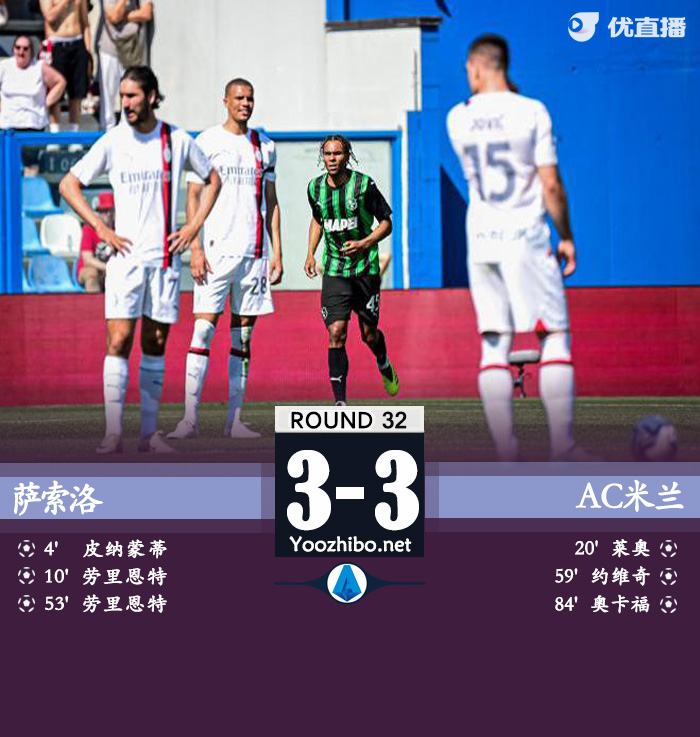 JRS直播网讯:北京时间4月14日,意甲联赛迎来第32轮的激烈对决,萨索洛与AC米兰展开了激烈的较量。上半场刚开场皮纳蒙蒂闪击建功,随后劳里恩特突入禁区射门被扑随后补射破门,之后莱奥1V2后低射追回一球。下半场阿德利被抢断,劳里恩特破门完成双响,随后莱奥外脚背传中被扑,约维奇补射破门,比赛尾声加比亚胸部一停,奥卡福尔抽射扳平,本场比赛丘库埃泽两粒进球被吹体毛越位。最终米兰3-3战平萨索洛。