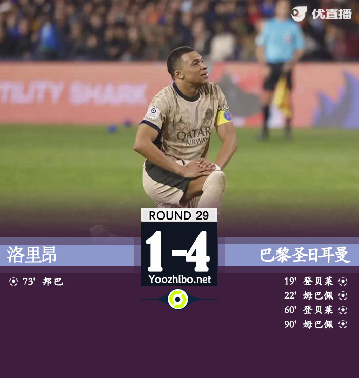 JRS直播网讯:北京时间4月25日凌晨1:00,法甲第29轮,巴黎客场对阵洛里昂。上半场,登贝莱远射破门;姆巴佩左脚脚后跟建功。下半场,姆巴佩超强过人助攻登贝莱完成双响;邦巴扳回一球;最后阶段姆巴佩再入一球完成双响!最终,巴黎客场4-1击败洛里昂,若随后摩纳哥不胜,将直接夺得本赛季法甲冠军。