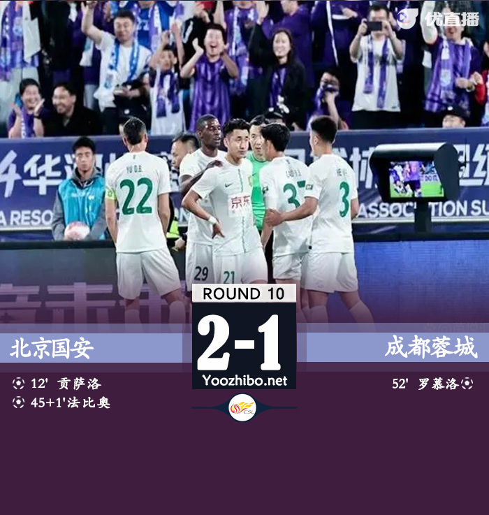 JRS直播网讯:北京时间5月5日19点35分,中超第10轮北京国安主场迎战成都蓉城。上半场,费利佩错失绝佳机会,古加兜射破门,法比奥补时再入一球。下半场,罗慕洛世界波扳回一球后射中一次立柱。全场比赛结束,北京国安2-1成都蓉城。